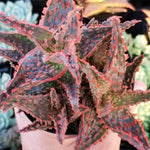 The brilliantly bumpy Aloe 'Oik' is a dwarf aloe hybrid with fairly short, triangular, bluish to greenish leaves. They are covered with irregular, broad, often multi-pointed pinkish teeth on the margins while the surface teeth are conical or merged to form raised dashes. Leaf apices are often bilaterally compressed with jagged teeth reminiscent of some medieval weapon. The word “oik," in its mildest connotation, is British slang for a rambunctious child. Reddish highlights develop when Aloe 'Oik' is given plenty of sun. Great in its own decorative container or in a dish garden with other succulents.
