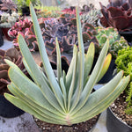 This beautiful tree Aloe grows tall, with a gray trunk that supports many forked branches. Clusters of fan-shaped blue-green leaves grow on each branch, giving this succulent its name. The leaves are oblong, growing upwards. As the old, lower leaves die, they fall off the branches, exposing more of the trunk.