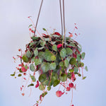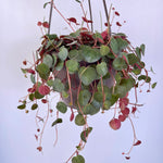 Peperomia Ruby Cascade is a beautiful semi-succulent houseplant that also thrives with filtered direct sunlight. This trailing plant forms round leaves along a vine with green on top and Ruby red underneath. Being a semi-succulent this plant retains some water in its leaves and can tolerate infrequent watering making it a low-maintenance easy to care for addition. This plant is shipped in a 6 inch hanging planter.