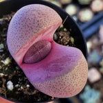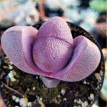 Pleiospilos nelii "Royal Flush" Split Rock has a gorgeous purple color and blooms a deep rose flower with a white center. I have pots with 2 per pot available right now. They resemble the photo of the pot with 2 Lithops. They are more green due to light conditions and will turn fully purple with more sun.