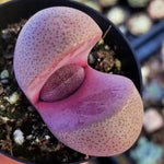 Pleiospilos nelii "Royal Flush" Split Rock has a gorgeous purple color and blooms a deep rose flower with a white center. I have pots with 2 per pot available right now. They resemble the photo of the pot with 2 Lithops. They are more green due to light conditions and will turn fully purple with more sun.