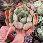 Import Echeveria Glam Pink has compact leaves with pointy tips and redish orange margins. This plant is mature.