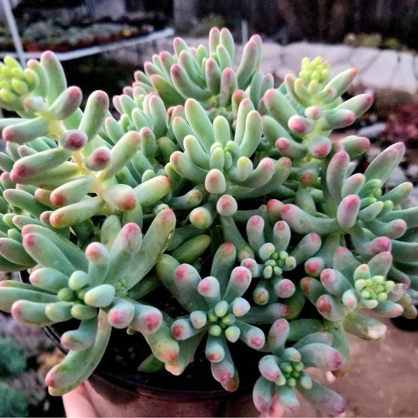 Sedum Pachyphyllum, Blue Jelly Beans, are a fun addition to your garden or landscape. These will turn red tipped when stressed during the summer or even a pretty yellow with red rips if stressed enough.